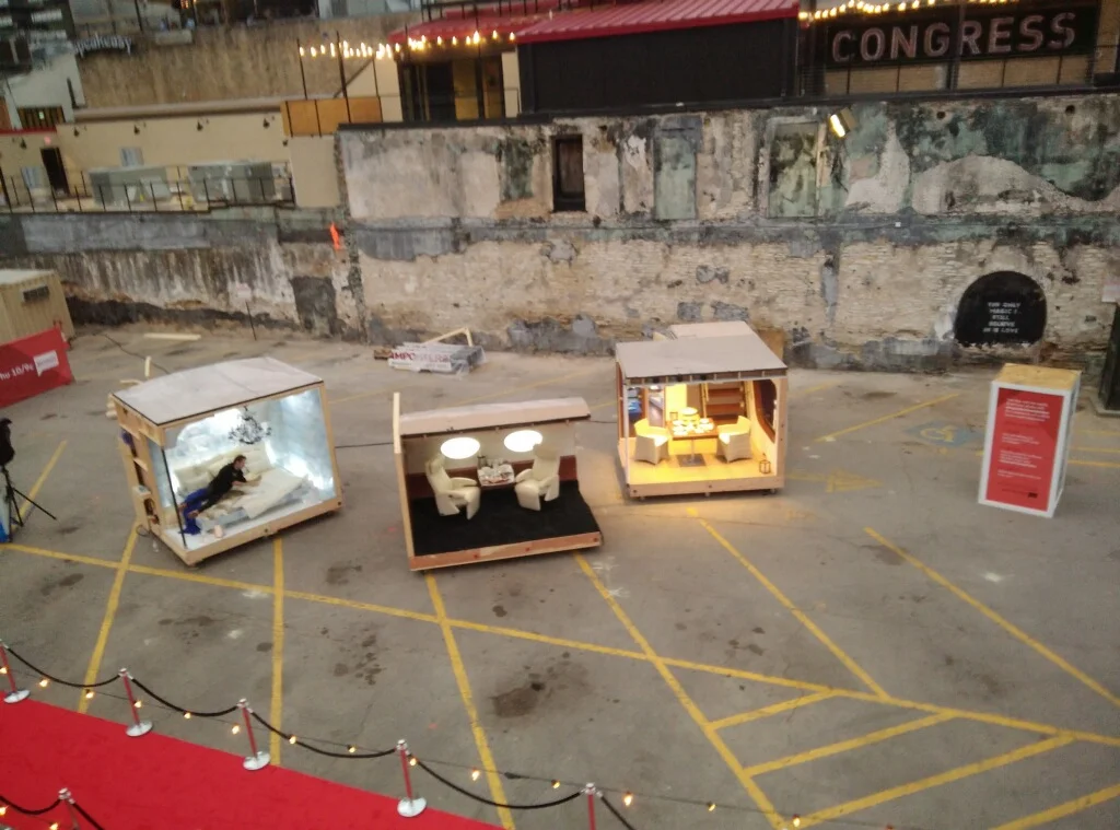 three elaborate sets were fabricated and installed in a vacant parking lot in downtown Austin, where SXSW attendees could get their photos taken. Everyone who entered the sets received two photos: one that was cropped perfectly so that it appeared they were truly in this "baller" situation (luxury yacht, private jet, or ice hotel), a second photo zoomed out to reveal the con. the photos were delivered digitally via snapfiesta.